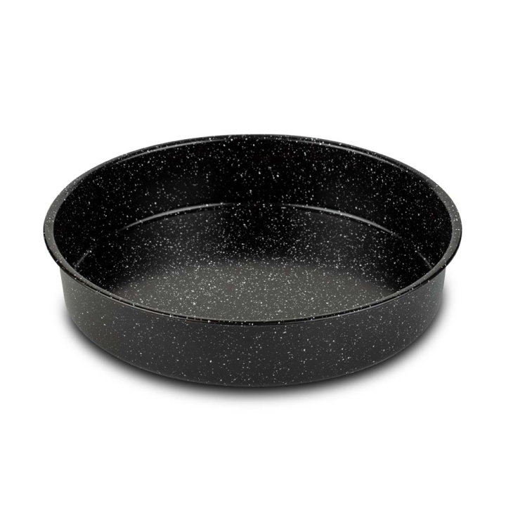 Съдът е изработен от въглеродна стомана, която осигурява равномерно разпределение на топлината и чудесни резултати при печене. Незалепващото каменно покритие позволява лесно изваждане на ястието, както и безпроблемно почистване след употреба.