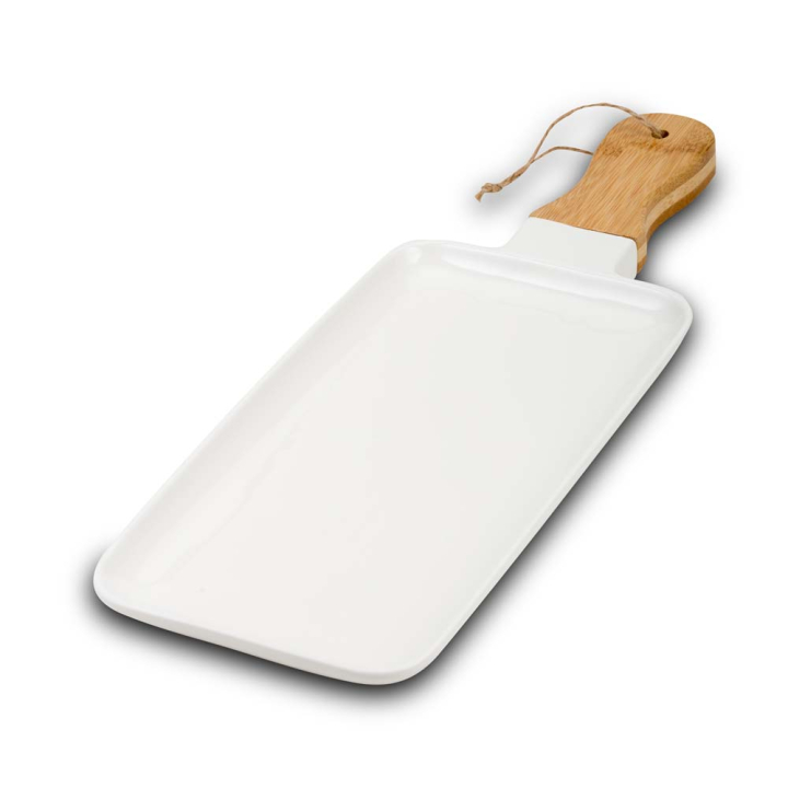Бяло порцеланово плато за сервиране с бамбукова дръжка, 15/3/41 см