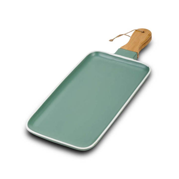 Порцеланово плато за сервиране в цвят мента с бамбукова дръжка, 13/3/47 см
