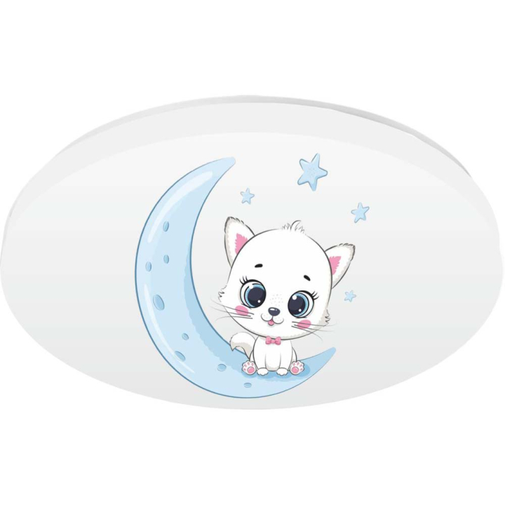 Сладка почти колкото вашето малко съкровище, очарователната плафониера ще украси тавана с чар и светлина! Зарадвайте мъника вкъщи, като допълните детската му стая с весела лампа, от която винаги ще се усмихва котето, седящо върху синя луна под сини звезди!