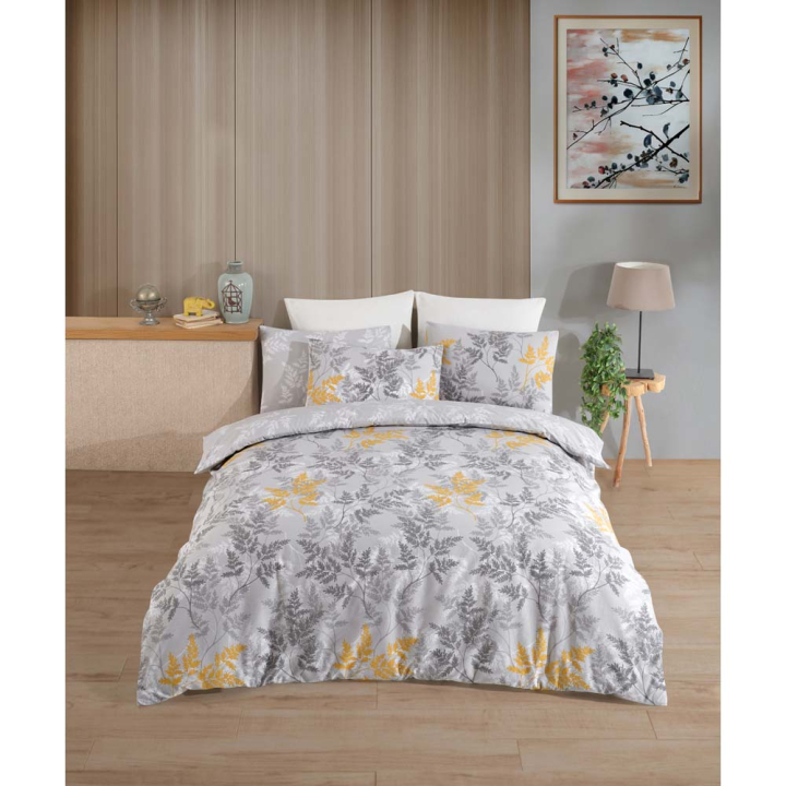 Спален комплект от 4 части с флорална декорация в сиво и жълто, 100% памук ранфорс