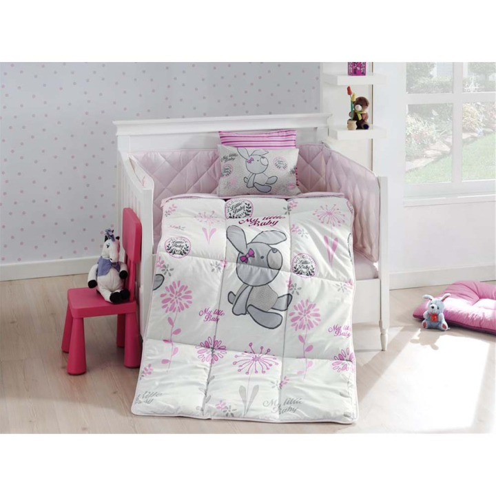 Вече не само вашата принцеса ще има панделки, а и нейното зайче, изобразено в средата на спалния комплект! Много нежно розово, с цветя, печати и надписи, това спално бельо ще обгърне с уют детенцето, а вие ще бъдете спокойни за пълноценния му сън през цялата нощ. Естествената материя е с висока плътност, мека и нежна към бебешката кожа, без да причинява алергии или зачервявания.