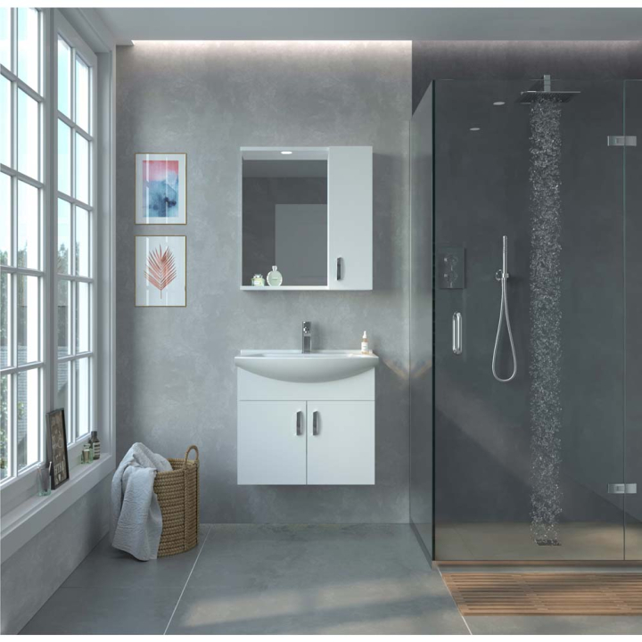 Комплект влагоустойчиви горен и долен шкаф за баня. Горният шкаф е с огледало, LED осветление, рафт и отделение с вратичка, със сребриста дръжка. Размери на шкафа Ш:65/Д:18/В:68 см. Долният шкаф е с порцеланова мивка и корпус с две врати, със сребристи дръжки и с размери Ш:65/Д:45/В:60 см. Притежава изчистена визия и стил в съчетание с удобство. Безпроблемно може да съхранявате всички вещи, които по принцип държим в банята, надеждно защитени от водните пръски, като за повече удобство вратичките на мебелите са с плавно затваряне. Комплектът е с единна дизайнерска визия и напълно ще преобрази санитарното помещение със своята клaса и стил.