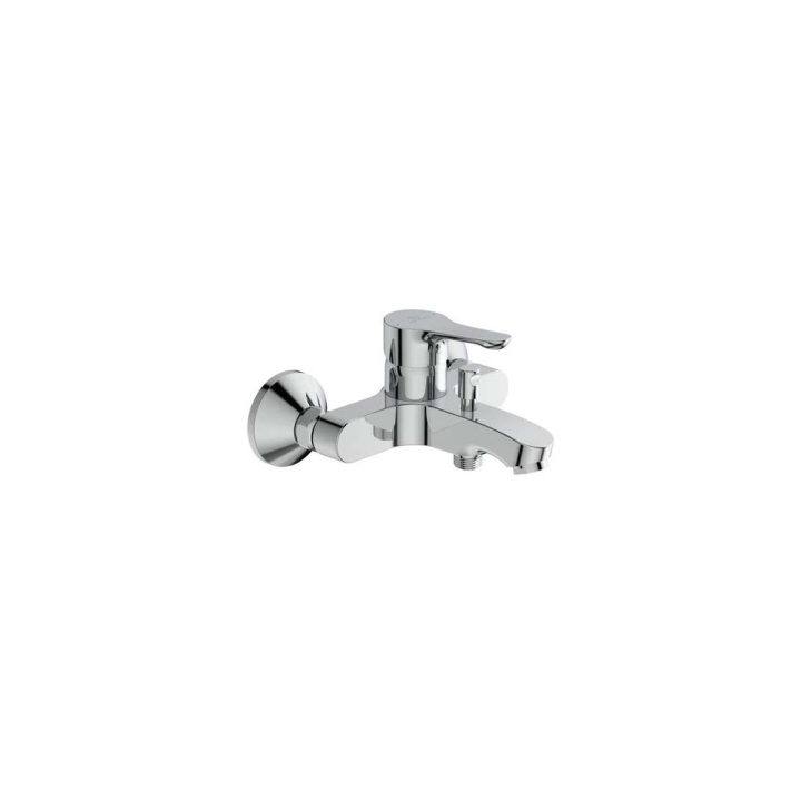 Стенен смесител за вана или душ с размери Д:18/В:15 см. Моделът притежава красива визия в съчетание на удобство и практичност. Притежава месингов корпус с гланцово хромирано покритие, лесно за поддържане и почистване, метална ръкохватка с индикатор за топла и студена вода, чучур с аератор, присъединител за душ и автоматичен разпределител на потока на водата. Монтиран в банята ще добави много стил и класа към помещението.