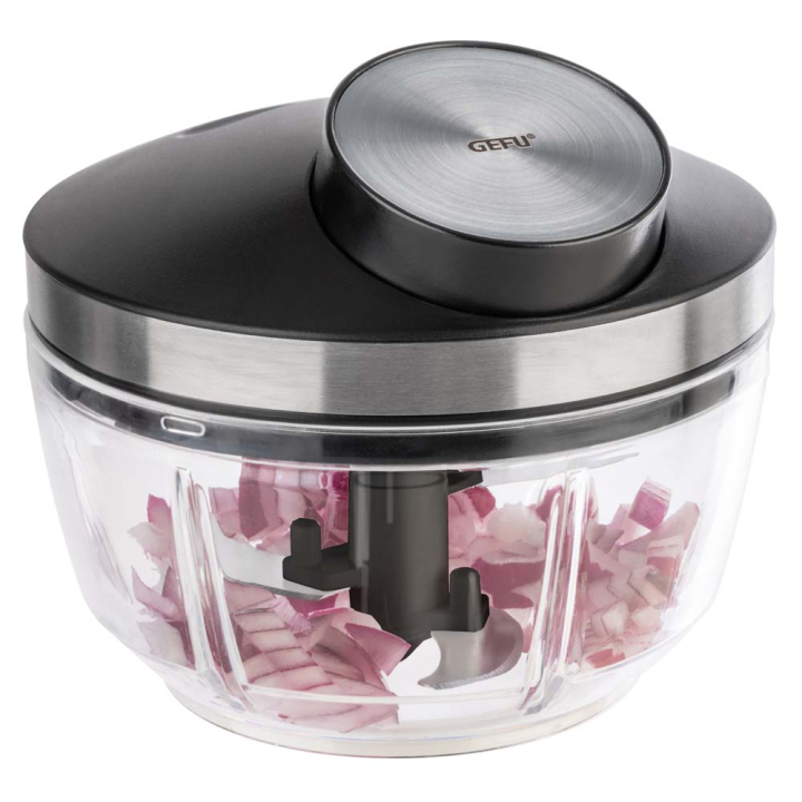Универсален уред с компактен размер, който бързо и лесно нарязва зеленчуци, ядки, плодове или превръща продуктите в хомогенна смес за десерт, при това без използване на електричество.