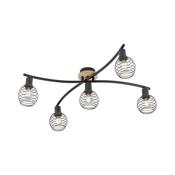 Плафониера 5х40W E14 в съчетание на черно и дървесно с метални решетъчни абажури.