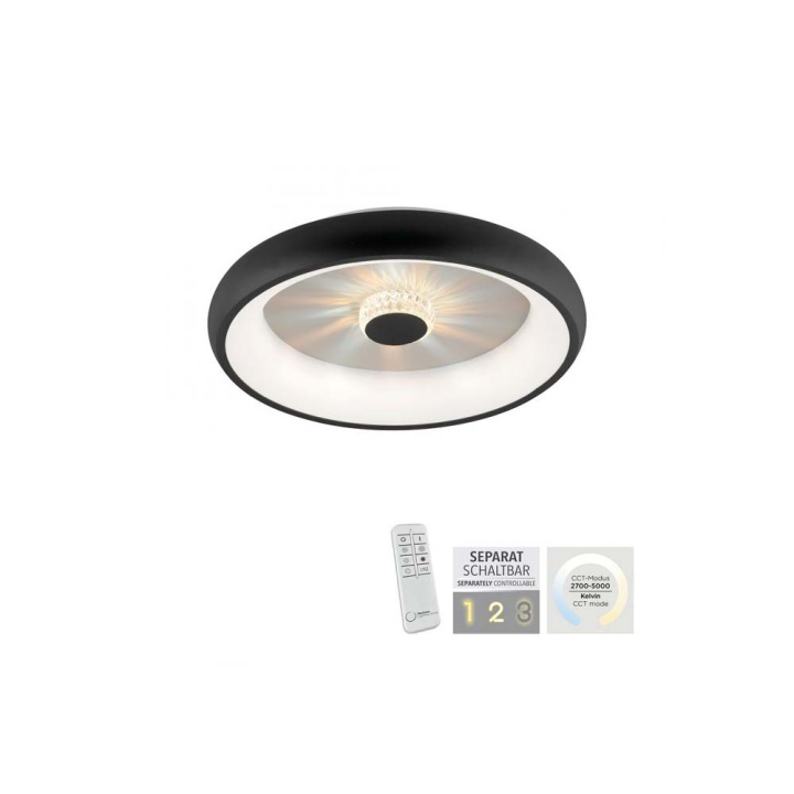 Включеното радиодистанционно управление осигурява перфектно удобство, без да се налага да мърдате от мястото си. Благодарение на интегрираната функция за памет, индивидуалните настройки остават и след изключване. С контрола на цветната температура CCT можете да регулирате тона от топла бяла светлина (2700 K) до дневна бяла светлина (5000 K). Специален акцент е красивият кристален ефект в средата на лампата. Това създава завладяваща игра на светлина. Оставете се да бъдете очаровани от искрящите отражения и се насладете на специалния привкус, който ще ви спечели!