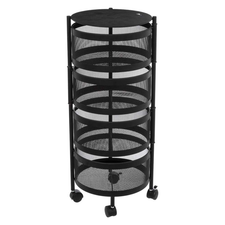 Практична черна количка с четири въртящи се кошници. Подходяща за съхранение на плодове и зеленчуци в кухнята или за козметика и продукти за грижа в банята. Количката е изработена от здрав метал и има черно покритие за елегантен външен вид. Колелата са изработени от пластмаса и имат стопери. Четирите мрежести кошници са разтегаеми, за да можете лесно да вземете продукти от кошниците.