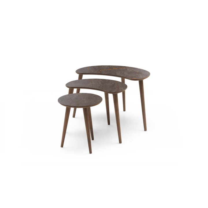 Елегантен и модерен сет от 3 помощни маси, с плот с дизайн на мрамор. Крачета с овална форма в цвят орех.