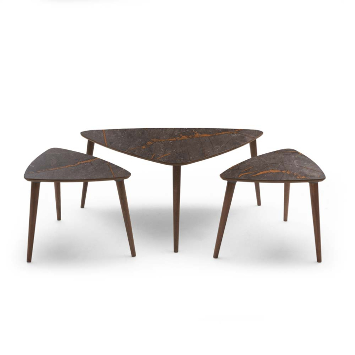 Елегантен и модерен сет от 3 помощни маси, плотове с триъгълна форма и с дизайн на мрамор. Крачета с овална форма в цвят орех.