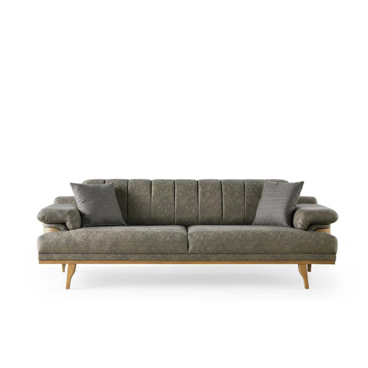 Атрактивен, шикозен и много стилен диван 3-ка, подходящ за вашия хол, фоайе или офис с размери 227/100/76 см. Всеки един детайл на дивана е внимателно обмислен и прецизно изработен. Притежава ефектна тапицерия с контрастен шев, обемни меки подлакътници, удобна обширна седалка, както и ефектна обемна облегалка. Дървената конструкция e с елегантни крачета, фино лакирани От двете страни на дивана са монтирани извити дървени плоскости, които създават много чар и домашен уют. Моделът разполага и с функция сън, като единствено чрез завъртане на облегалката обособява площ с големина 170/88 см.