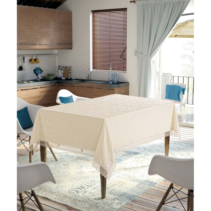 Луксозна покривка за маса от полиестер в светлобежов цвят (крем) с бродерия, 160/220 см.