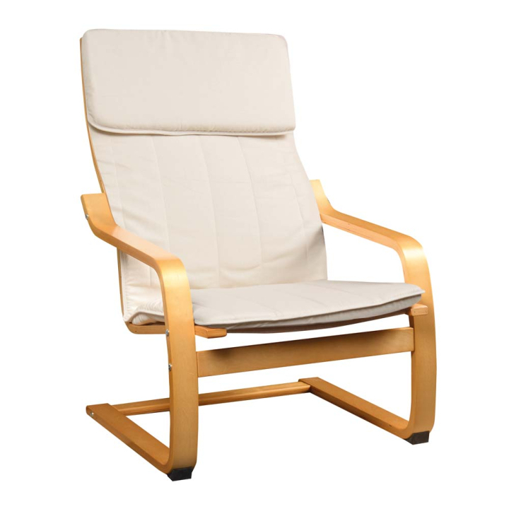 Модерен фотьойл с размери Ш:67/Д:81/В:97 см. Качествен и удобен фотьойл произведен от дървесина, който ще ви предостави комфортен престой и почивка. Притежава текстилна седалка снабдена с възглавница, както и два стилни подлакътника, естествено продължение на C-образната рамка на фотьойла. Може да направите избор и да поръчате рамката да бъде със светла или тъмна дървесна текстура, а тапицерията на възглавницата в бяло. Практично може да поставите модела, както у дома в хола или на терасата, така и в градината под навеса. За най-претенциозните от вас, може да поръчате табуретка със същата дизайнерска визия, за удобното поставяне на краката или за седене.