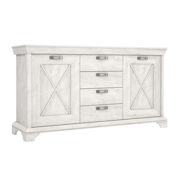 Комод с чекмеджета с размери Ш:178.3/Д:48.2/В:95.9 см. Моделът притежава елегантен плот с висок кант по периферията за удобното съхранение на малки домашни предмети, снимки или арт декорация. Под плота са обособени 2 самостоятелни отделения с врати на панти, като и 4 чекмеджета със сачмени водачи. Притежава декоративен арт цокъл, стилни метални дръжки и атрактивна рамка на вратите с X образни елементи, които напълно се вписват към дизайна на модела и създават уникалната му визия. Дизайнът на шкафа е в типичен винтидж стил с класически детайли добавящи комфорт и уют, но и нотка романтика. Тези малки детайли създават домашен комфорт, който без усилие променя атмосферата в помещението и то става по-уютно. Моделът е произведен от ПДЧ в топъл бял дървесен декор. Имитацията на дървесна борова текстурата е красива с вълниста шарка и леко грапава повърхност, като топлите тонове са доминиращи.