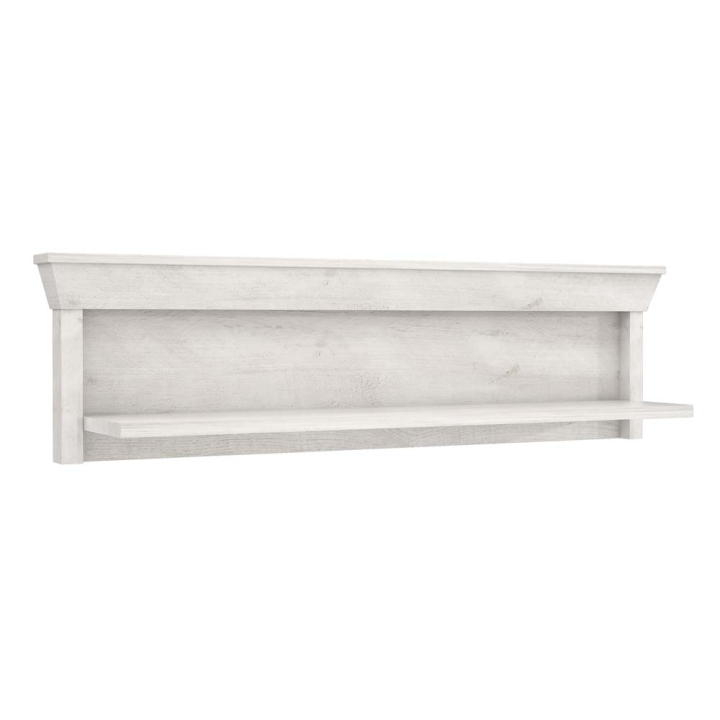 Полица с размери Ш:121/Д:23.6/В:33.5 см. Моделът е проектиран с обширен и дълбок рафт където място ще намерят артефакти, снимки, бестселъри или малки статуетки. Дизайнът на полицата е в типичен винтидж стил с класически детайли добавящи комфорт и уют, но и нотка романтика. Стенният панел, към който е прикрепен рафта, е с декоративен корниз, който създава уникалната визия на полицата. Тези малки детайли добавят домашен комфорт, който без усилие променя атмосферата в помещението и то става по-уютно. Моделът е произведен от ПДЧ в топъл бял дървесен декор. Имитацията на дървесна борова текстурата е красива с вълниста шарка и леко грапава повърхност, като топлите тонове са доминиращи.