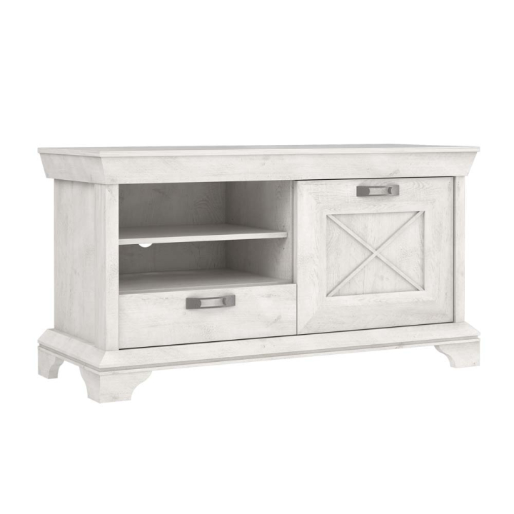 ТВ шкаф с размери Ш:123/Д:48.2/В:66.6 см. Моделът притежава елегантен плот с висок кант по периферията за безопасното поставяне на телевизор. Под плота е поставен 1 рафт, образуващ 2 отворени ниши, 1 практично чекмедже, както и 1 отделение с врата на панти. Притежава декоративен арт цокъл, стилни метални дръжки и атрактивна рамка на вратата с X образни елементи, които напълно се вписват към визията на модела и създават уникалната му визия. Дизайнът на шкафа е в типичен винтидж стил с класически детайли добавящи комфорт и уют, но и нотка романтика. Тези малки детайли създават домашен комфорт, който без усилие променя атмосферата в помещението и то става по-уютно. Моделът е произведен от ПДЧ в топъл бял дървесен декор. Имитацията на дървесна борова текстурата е красива с вълниста шарка и леко грапава повърхност, като топлите тонове са доминиращи.