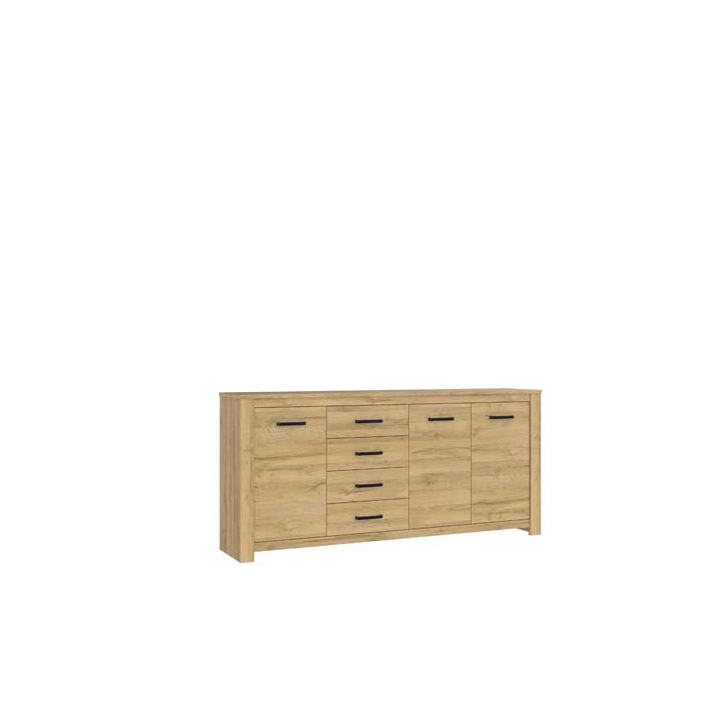 Бюфетен шкаф с четири чекмеджета с размери Ш:206/Д:42/В:95 см. Моделът се отличава с автентично дървесно излъчване на топлина и домашен уют, както и функционално вътрешно разпределение. Добър избор за обзавеждане на хола или дневната. Конструкцията е здрава и стабилна, произведена от ПДЧ с характерно излъчване на солидност на шкафа. Притежава четири чекмеджета практично поставени в средата на бюфета, както и две странични отделения с три врати на панти, зад които са монтирани два вътрешни рафта. Вратите, както и чекмеджетата на бюфета са с черни дръжки, напълно пасващи на цялостната визия на модела. Върху горният плот в дървесен декор удобно може да поставите, артефакти, снимка на любим човек или ваза с красиво цвета и напълно да промените атмосферата в помещението.