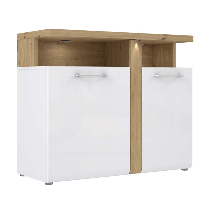 Комод с декоративно LED осветление с размериШ:103.5/Д:43/В:86 см. Разполага с две врати на панти, две отворени ниши, както и плот удобен за поставянето на артефакти, снимки на любим човек или ваза с цвете. Със своята дървесна декорация (дъб Артисан) и бял цвят, моделът е изключително атрактивен и ще играе голяма роля в интериора на дома, като добави много положителна енергия.