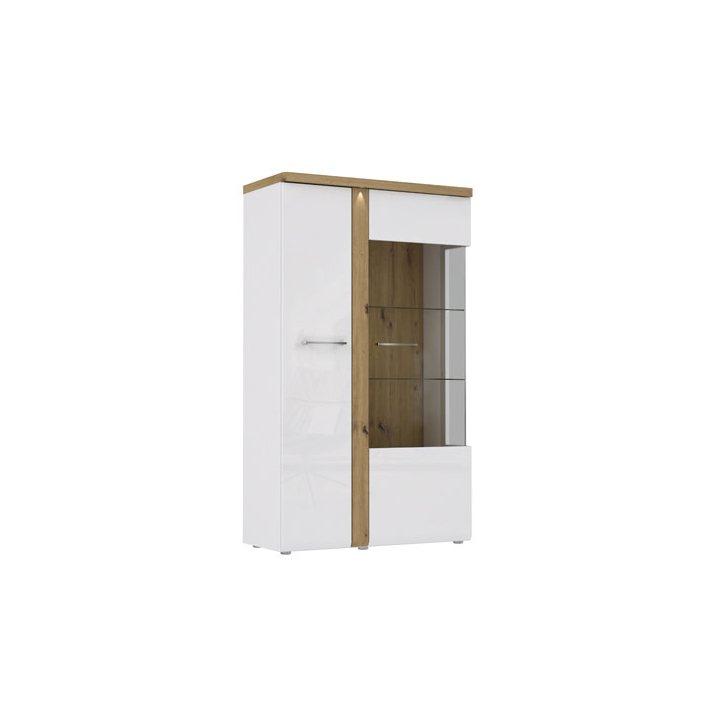 Двоен витринен шкаф с LED осветление с размери Ш:98/Д:43/В:164 см. Шкафът е произведен от ПДЧ и MDF, като вътрешното разпределение се състои от две отделения с монтирани рафтове. Моделът е практично обзавеждане на дневната, където любимите ви вещи, артефакти и снимки на любими хора ще са надлежно представени и съхранени. Със своята дървесна декорация (дъб Артисан) и бял цвят, моделът е изключително атрактивен и ще играе голяма роля в интериора на дома, като добави много положителна енергия.