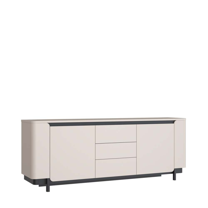 Конструкцията е проектирана и произведена с практично вътрешно разпределение, зад което ще откриете: 3 чекмеджета, позиционирани в средната част на комода, както и 2 огледално разположени части - лява и дясна, в които ще откриете по 1 разделителен рафт, предлагащи просторно място, както и механизъм за плавно затваряне, който предпазва материала на изработка - /МДФ, ПДЧ/ от нараняване при затваряне.