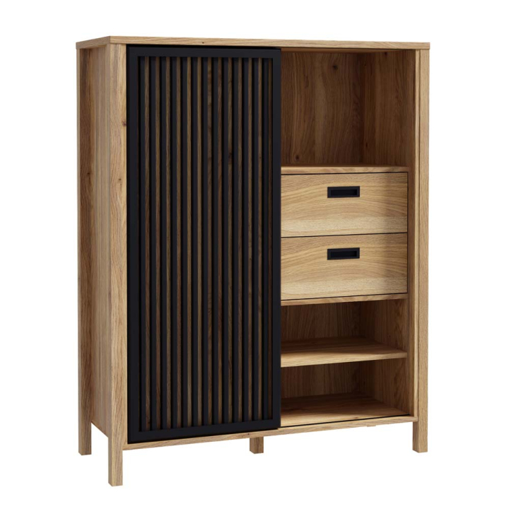 Стилен контрабюфет с практично разпределение, който предоставя разупена визия, създаваща баланс между светъл дървесен и черен цвят.