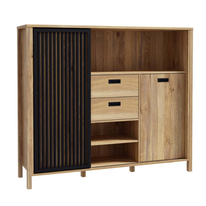Стилен контрабюфет с практично разпределение, който предоставя разупена визия, създаваща баланс между светъл дървесен и черен цвят.