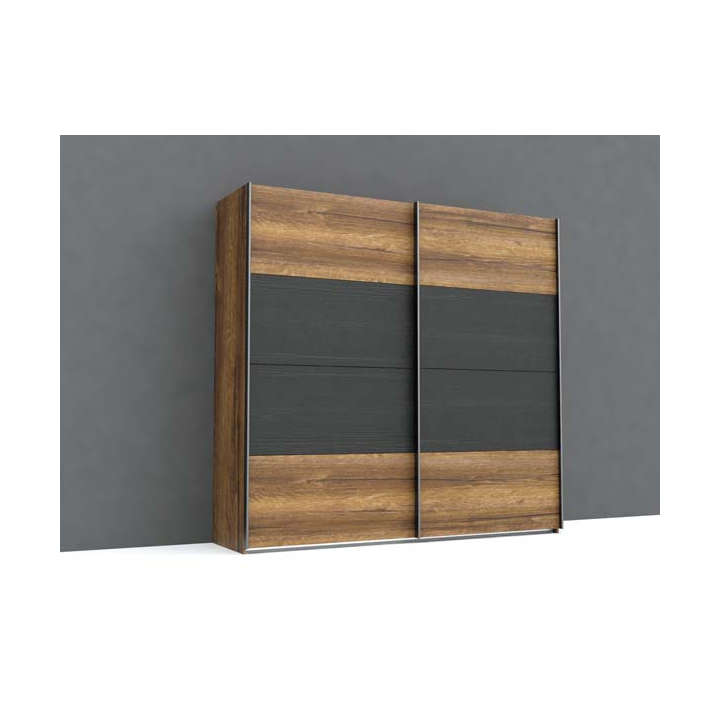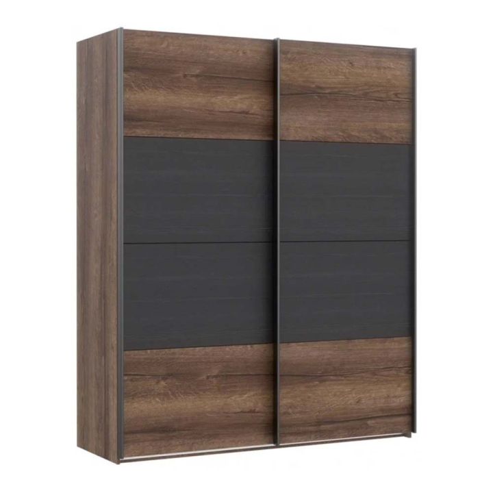 Класически гардероб с плъзгащи врати с размери Ш:170.3/Д:61.2/В:209.7 см. Вътрешното разпределение на модела е стандартно. Състои от 2 отделения с монтирани в тях 2 рафта и 2 лоста за дрехи. Под лостовете има достатъчно място за поставянето на кутии за съхранение на дрехи или куфари. Това което прави гардероба уникален е красивата текстура в черен дъб и тъмен дървесен декор с откроени чворове и пукнатини. Корпусът на гардероба е произведен от ПДЧ в тъмен дървесен декор. Вратите са в два декора, стилно моделирани в черен дъб и тъмен дървесен декор. Моделът добавя с лекота класа и уют към помещението. Предназначен е за обзавеждане на спалното помещение, но чудесно ще стои и в коридора или антрето.