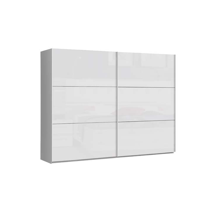 Гардероб с плъзгащи врати с размери Ш:269.9/Д:61.2/В:209.7 см. Вътрешното разпределение на модела се състои от 3 отделения, в които са монтирани по 1 лост за закачалки и 1 горен рафт. Под лоста за дрехи има достатъчно място за поставянето на кутии за съхранение на дрехи или куфари. Моделът е произведен от ПДЧ в бял гланц, създаващ усещане за чистота и хармония, изключително подходящ за спални помещения. Може да бъде поставен както в спалнята, така и в антрето.