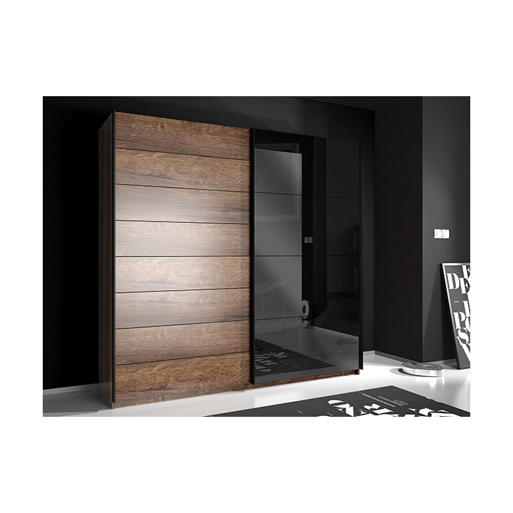 Двукрилен гардероб с плъзгащи врати с размери Ш:220.1/Д:61.2/В:209.7 см. Моделът се състои от 2 отделения достъпни посредством 2 плъзгащи се врати, 1 от които е с черно стъклено покритие. Другата врата на гардероба е в тъмна дървесна текстура. В лявото отделение е монтиран 1 лост за закачалки и 1 горен рафт. Под лоста за дрехи има много място за съхранение на кутии за обувки или куфари. В дясното отделение е монтиран 1 лост за закачалки, както и 1 горен рафт. Под лоста за дрехи са монтирани 3 регулируеми рафта равномерно поставени по височината на гардероба. Дръжките са тип лайсна в черен цвят, монтирани по цялата височина на вратите. Към гардероба допълнително може да добавите механизъм за плавно затваряне на вратите, скрин за вграждане, и както и паспарту с размери Ш:230.9/Д:23.8/215.1 см. Цветовото съчетание на модела е удачно, стилна комбинация между черно стъкло и тъмен дървесен декор. Със своят луксозен дизайн и вродена класа добавят усещане на висок стандарт и благосъстояние.