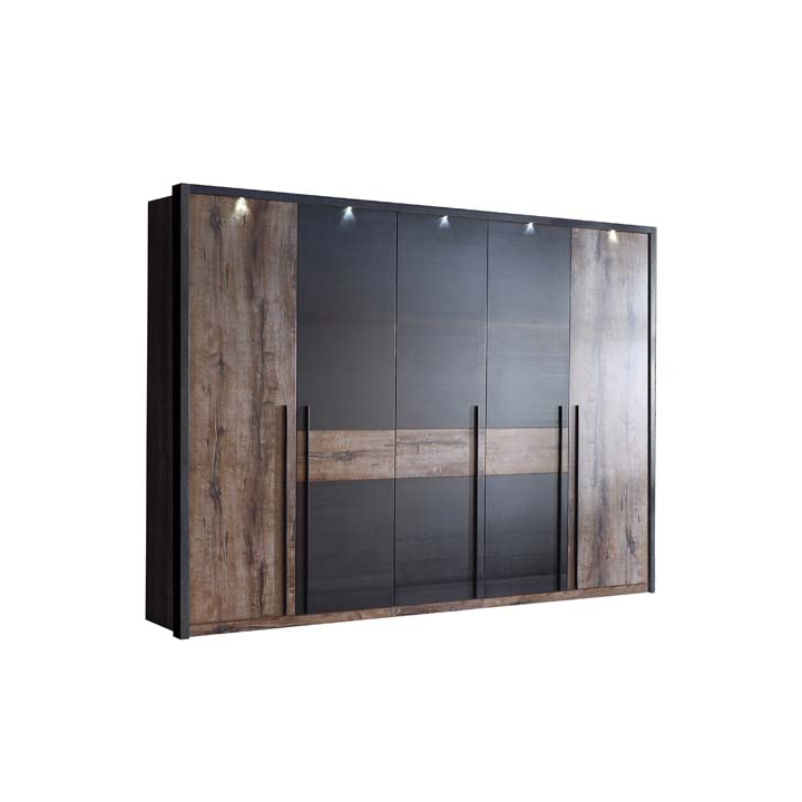 Петкрилен гардероб с размери Ш:260.8/Д:62.3/В:220 см. Освен много красив, гардеробът притежава практично вътрешно разпределение от 3 самостоятелни отделения. Лявото и дясното отделение са еднотипни, с по 2 врати на панти, зад които са монтирани по 1 рафт и 1 лост за закачалки. Средното отделение e с 4 рафта, равномерно поставени по височината на гардероба. Продуктът е произведен от ПДЧ, в два декора. Тъмният дървесен декор е изключително красив (състарен дъб), с откроени чворове и дървесни пукнатини, като комбиниран с черната дървесна текстура прави модела първокласен. Паспартуто към гардероба в черен дървесен декор и LED осветление, ще добави много чар и уют към помещението. Със своите големи размери и практично разпределение, моделът е подходящ за обзавеждане на просторни спални, споделяни от двойки.