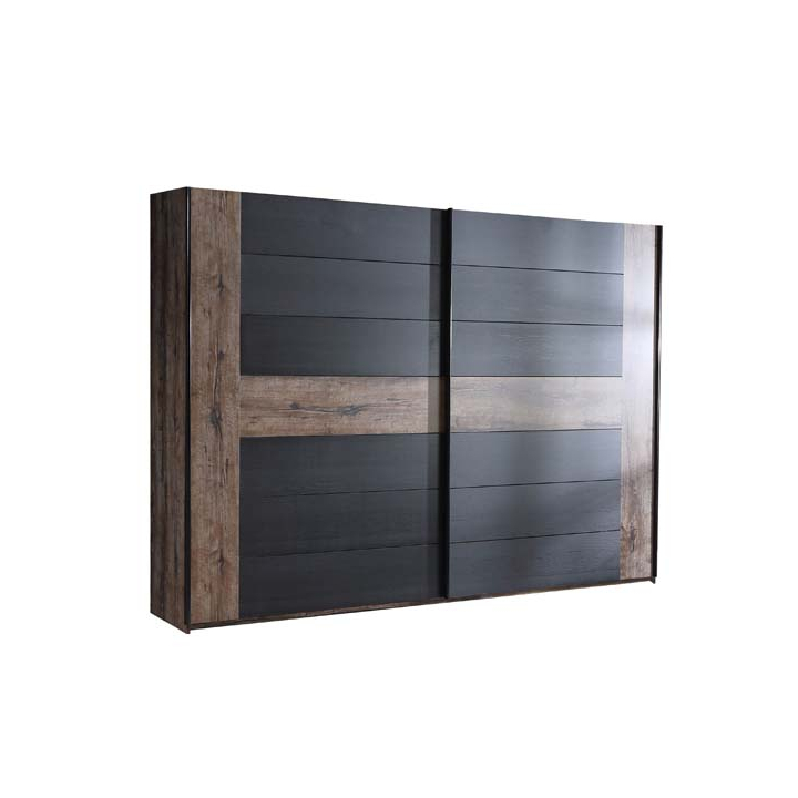 Двукрилен гардероб с плъзгащи врати с размери Ш:269.9/Д:61.2/В:209.7 см. Освен много красив, гардеробът притежава функционално вътрешно разпределение от 2 отделения. В лявото по-обширно отделение са монтирани 1 рафт, 1 делителна страница и 2 лоста за закачалки. В дясното отделение са поставени 1 рафт и 1 лост за закачалки. С допълнителна поръчка може да добавите към гардероба комплект от рафтове, паспарту с LED осветление, скрин за вграждане или мех. за плавно затваряне на вратите. Продуктът е произведен от ПДЧ, в два декора. Тъмният дървесен декор (състарен дъб) е изключително красив, с откроени чворове и дървесни пукнатини, като комбиниран с черната дървесна текстура прави модела първокласен. Със своите големи размери и практично разпределение, моделът е подходя за обзавеждане на просторни спални споделяни от двойки.