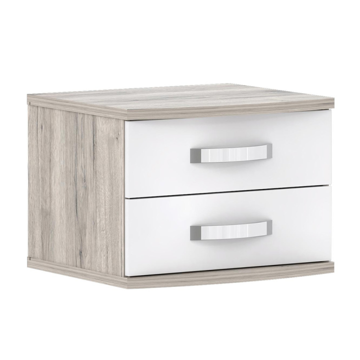 Нощно шкафче с чекмеджета с размери Ш:50.4/Д:46/В:41.1 см. Проектирано е с удобен плот в дъбова текстура за поставяне на предмети от ежедневието, под който са монтирани 2 чекмеджета със сребристи метални дръжки. В предната час, нощното шкафче е с овална форма, дизайнерска особеност, която го прави по-атрактивенo. Произведено е от ПДЧ в дървесна репродукция. Пясъчният дъб е в светли нюанси, текстура представяща красивата дървесна сърцевина, която ще добави много положителна енергия към помещението.