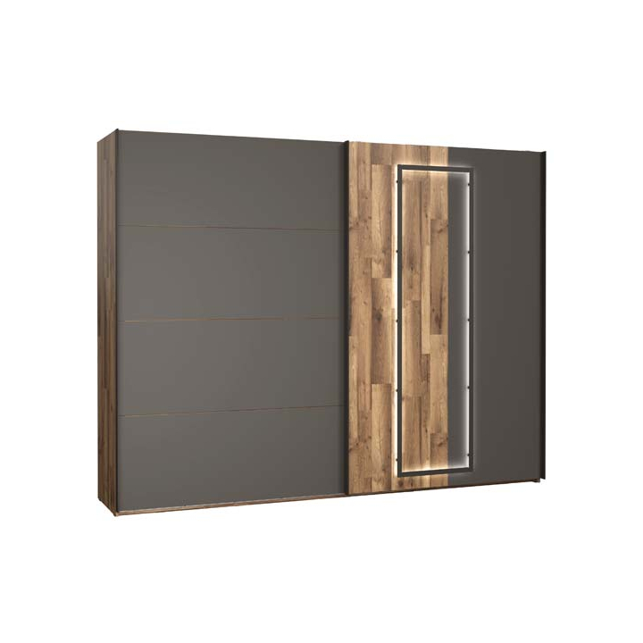 Модерен гардероб с 2 плъзгащи врати с размери Ш:269.9/Д:61.2/В:210.5 см. Зад вратите са обособени 3 отделения, 1 от които по-компактно. Гардеробът разполага 3 лост за дрехи, както и 3 горни рафта. Допълнително може да добавите комплект от рафтове и вътрешен скрин и да направите вътрешното разпределение по-функционално. Друго удобство, което ще направи гардероба по-лесен за употреба са механизмите за плавно затваряне на вратите.