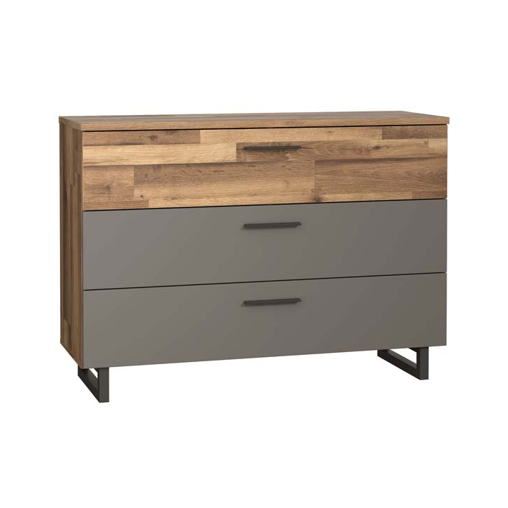 Модерен комод с чекмеджета с размери Ш:120.1/Д:41.3/В:85.5 см. Разполага с плот в светла дъбова текстура, както и 3 обширни чекмеджета, подредени едно под друго. Дрехи, одеяла, завивки, лични вещи и аксесоари ще намерят своето място в чекмеджетата, прилежно подредени и съхранени. Комодът е в двуцветна декорация, визуално открояваща плота, конструкцията и от 1 чекмеджетата от долните 2 чекмеджета в сив цвят. Сивата текстура по-скоро създава усещане за класа и прагматизъм, докато дъсчена дървесна текстура, репродукция на дъб, добавя така нужната топлина и уют към по-умерения сив цвят.