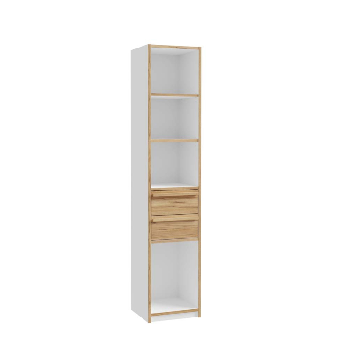 Четириредова етажерка с две чекмеджета с размери на продукта Ш:44.3/Д:42.2/В:215 см. Моделът е здрав и стабилен произведен от ПДЧ, с монтирани две практични чекмеджета за съхранението на дреболийки, както и четири отворени ниши. Притежава изчистен дизайн в цветова комбинация от бял цвят и светъл дървесен декор, репродукция на класически дъб с чворове (дъб Катания). Моделът е мебел от цялостна серия мебели за обзавеждане на спално помещение S-ROOM FORTE.