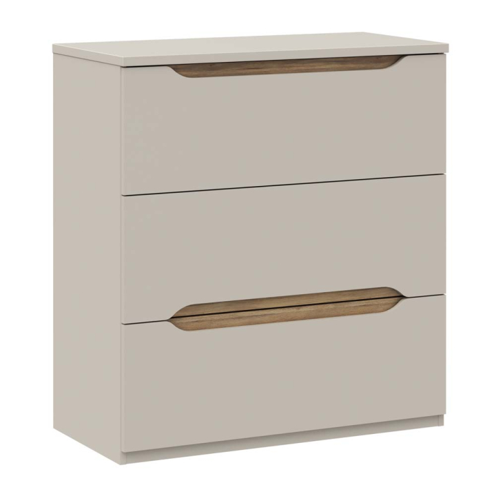 Комодът Едвал съчетава функционалност с естетика, която внася спокойствие и баланс в пространството. Светлият кашмирен тон, допълнен от топли дъбови вложки, създава усещане за уют, а изчистените линии и вертикалният силует го правят елегантен и универсален елемент в интериора.