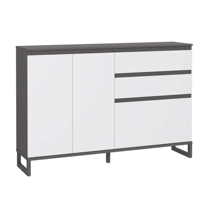 Конструкцията е изработена от ПДЧ в комбинация от графитено сив корпус и бяла фасада, която визуално разширява пространството.