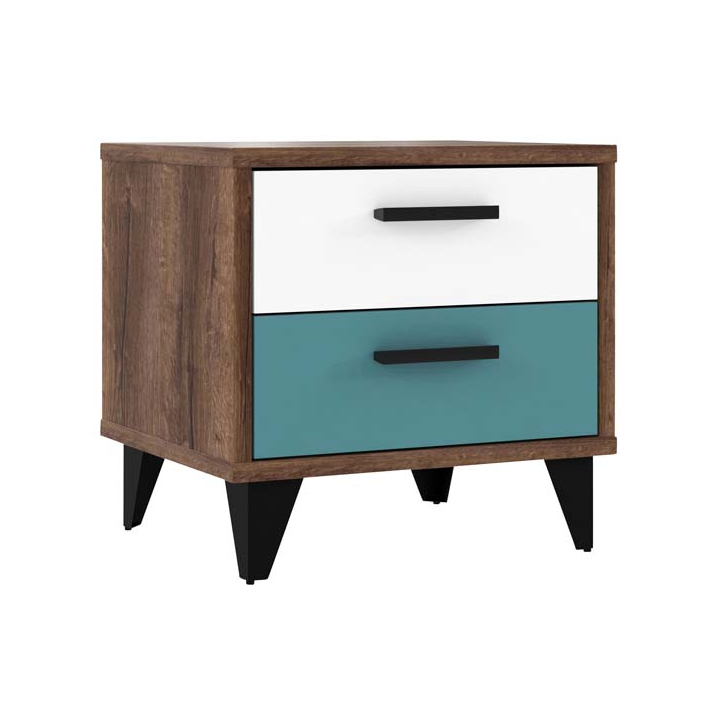 Нощно шкафче с размери Ш:49.8/Д:41.5/В:48.5 см. Моделът е с атрактивна многоцветна декорация, комбинация между тюркоазен, бял и черен цвят, както и тъмен дървесен декор. Шкафчето е произведено от ПДЧ, проектирано с компактен плот за поставянето на лични вещи, под който са обособени две чекмеджета с черни дръжки. Фронтът на горното чекмедже е в бяло, а на чекмеджето под него в тюркоазен завладяващ цвят зареден енергия на красота и хармония. Дървесният декор на модела завладява със своята автентична дъбова текстура в тъмни шарки и дървесни пукнатини, като към модерната многоцветна декорация добавя топлина и уют.