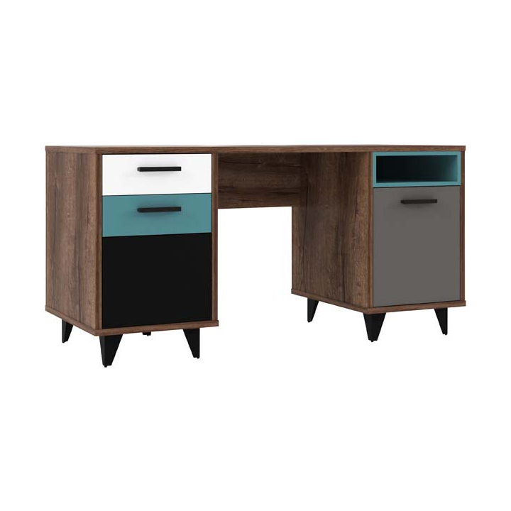 Модерно бюро с размери Ш:150/Д:60/В:74 см. Моделът е с атрактивна многоцветна декорация, комбинация между тюркоазен, бял, сив и черен цвят, както и тъмен дървесен декор. Бюрото е произведено от ПДЧ, проектирано с достатъчно голям плот за поставянето на лаптоп или монитор на персонален компютър, под който са обособен две чекмеджета, една отворена ниша, както и две отделения с врати на панти с плавно затваряне. Фронтовете на чекмеджетата са декорирани в бяло и тюркоазено, а вратите на панти в сиво и черно. Отворената ниша е в тюркоазен цвят зареден с положителни емоции с вродена красота и хармония. Дървесният декор на плота и конструкцията завладява със своята автентична дъбова текстура в тъмни шарки и дървесни пукнатини, като към модерната многоцветна декорация добавя топлина и уют. Чудесен избор за обзавеждане на детската стая, като със своята визия цялостно ще преобрази атмосферата в помещението. Среда на спокойствие, комфорт и креативизъм, така необходими за здравословното израстването на децата.