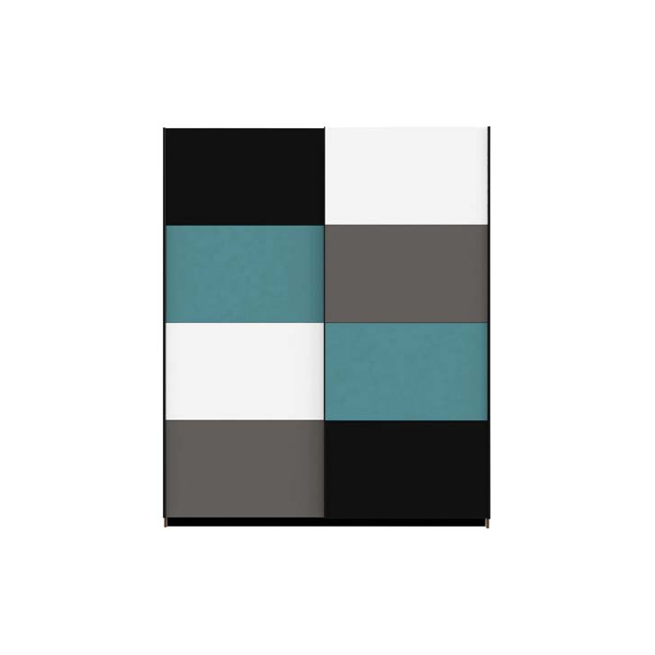 Гардероб с плъзгащи врати с размери Ш:170.3/Д:61.2/В:209.7 см. Притежава атрактивна визия с акцент към модерната визия и домашната естетика обособена от малките детайли, стилно допълващи дизайна на гардероба. Моделът е с атрактивна многоцветна декорация, комбинация между тюркоазен, бял, сив и черен цвят, както и тъмен дървесен декор. Корпусът е произведен от ПДЧ, в светъл дървесен декор, а плъзгащите врати са шахматно оцветени в черно, бяло, тюркоазено и сиво, създаващи приятна младежка атмосфера. Зад плъзгащите врати са монтирани по един лост за дрехи, както и по един рафт. Със своите две еднотипни отделения гардеробът е удачно решение за обзавеждане на детска стая или спалня, като дрехите с различно предназначение и стил ще са добре подредени и съхранени.