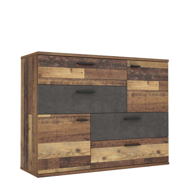 Модерен комод с чекмеджета с размери Ш:124.9/Д:41.3/В:95.9 см. Разполага с две отделения с врати на панти, както и четири практични чекмеджета. Със своята визия удачно ще стои във всяко кътче в дома като добави нотка чар и практично място за съхранение на малки домашни предмети. Чекмеджетата са две по две странично подредени едно под друго, като средните две са със сиви фронтове. Красивата дъсчена репродукция, комбинация от светла и тъмна дървесна текстура с чворове и ефект състарено дърво, винаги ще се отличава и привлича вниманието в помещението.