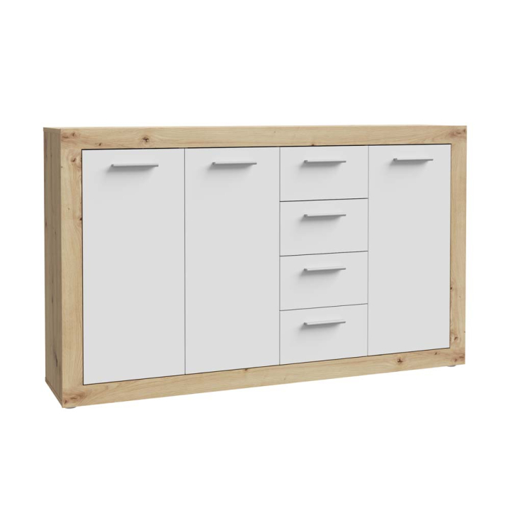 Притежава елегантна визия и цветово съчетание от корпус в текстура от дъб артисан, и фронт в бял цвят, което придава уютен и приветлив вид върху цялостния облик на тази мебел.