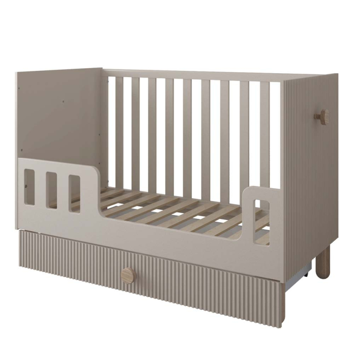 Елегантност, функционалност и естествени детайли – леглото е съчетание от модерни форми, естествени материали и практични решения за детската стая. В деликатен кашмирен нюанс с бук, то създава уютна и приятна интериорна среда. Креватчето разполага с преграда с две подвижни ребра, които могат да се свалят. Цялостната му структура осигурява отлична вентилация и позволява на родителите постоянно да виждат детето си от всички страни. Дизайнът насърчава безопасността и комфорта на детето.