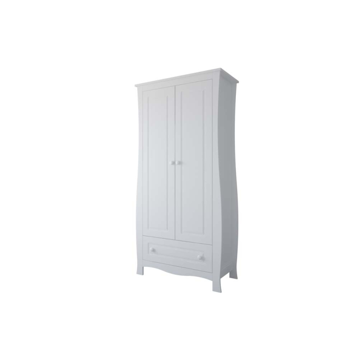 Красив просторен гардероб, практичен и модерен, идеален за бебешка стая, както по-късно и за стая на по-голямо дете. Изработен изцяло от бяла мебелна плоскост и МДФ плоскост. Вратите са с функция за отваряне надясно или наляво, в зависимост от монтажа на пантите. В долната част има голямо чекмедже, което със сигурност ще побере много дрешки, бельо или принадлежности. В центъра е монтирана вертикална плоскост, която разделя на две основни отделения - дясна страна с рафтове и лява страна със закачалки. Чекмеджето е с метални ролкови водачи с безопасен ограничител за предотвратяване на изпадне. Единият рафт е неподвижно монтиран, останалите два са с възможност за регулиране на различни нива с промяна само позицията на опорните щифтове.