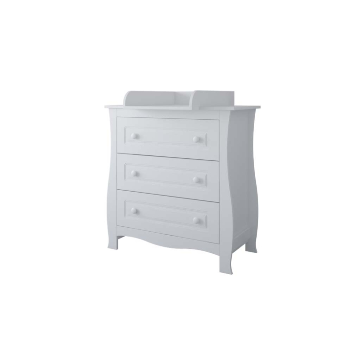 Скринът е изработен изцяло от бяла мебелна и МДФ плоскост. Стилните заоблени крака придават елегантен и модерен облик. Има три дълбоки чекмеджета, които със сигурност ще поберат много бебешки дрешки и принадлежности. Монтирани са на метални ролкови водачи с безопасен ограничител за предотвратяване изпадане от водача, а в лицевата част имат красиви фрезовани мотиви. В горната част на скрина можете да поставите специалния плот с адаптиран ограничител, за смяна на пелени и дрешки, който е изключително удобен и практичен. Когато детето порасне, само с едно просто движение, той се отстранява, за да може повърхността да се използва с друго предназначение.