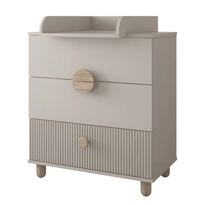 Скринът от колекцията LOFT е универсален елемент от обзавеждането на бебешката стая, който съчетава модерна естетика с висока функционалност. Дизайнът му е в неутрален кашмирен цвят, а дръжките и крачетата са от естествено буково дърво, което го прави идеален както за детската стая, така и за стая за подрастващи. Подходящ е и за различни интериорни концепции. Оборудван с три просторни чекмеджета, които предлагат достатъчно място за всекидневни вещи. Безшумните плъзгащи се врати осигуряват комфорт, а дълбочината и широчината на чекмеджетата поддържат стаята подредена и чиста. Благодарение на компактните си размери, скринът е идеален дори за по-малки пространства, като същевременно предлага голямо място за съхранение.