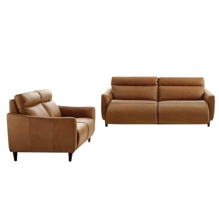 Комплект луксозни дивани с красив изискан дизайн, тапицирани с естествена кожа с размери Ш:160/Д:100/В:96 см и Ш:192/Д:100/В:96 см. Диваните са с различни размери, но с идентична визия, тапицирани с естествена кожа с декоративни шевове. Отличават се с дълбоки удобни седалки, обемни статични възглавници с обособени подглавници и много естетика доминирана от естествената кожа. Голямо предимство на дамаската от естествена кожа пред текстилната, е че не избледнява с времето, много по-комфортна е за тялото поради своя естествен произход, като същевременно остарява с годините по красив начин. Кожата не задържа прах и алергени, като с времето става по-гъвкава и по-удобна.