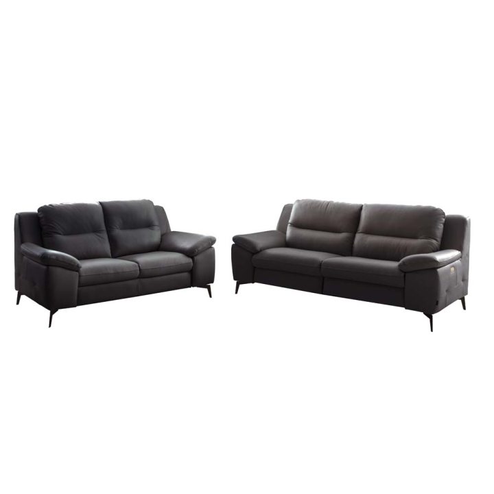 Комплект от 2-местен и 3-местен диван с размери Ш:180/Д:104/В:96 см и Ш:215/Д:104/В:96 см. Моделите предлагат завиден комфорт със своите обемни възглавници за седене и облягане с пълнеж от полиуретанова пяна. Обгърнати в удобство и комфорт, дневната ще се превърне в любимо местенце за релакс и почивка. Тапицерията на възглавниците е произведена от кафява естествена кожа, лесна за поддържане и почистване. Триместният диван е снабден с два електрически реклайнера, механизъм за лесно поставяне на тялото в легнало положение, чрез повдигане на краката и хоризонтиране на облегалката, посредством бутони под подлакътника.