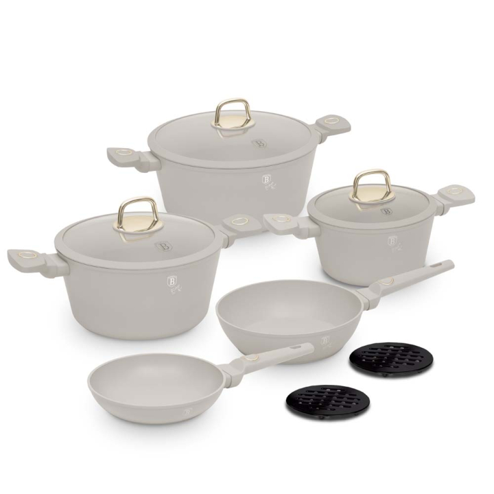 Комплект съдове за готвене от 10 части, изработен от кован алуминий с 3-слойно гранитно-мраморно незалепващо покритие. Външна повърхност в бежово с характерната иновативна визия на бранда.
