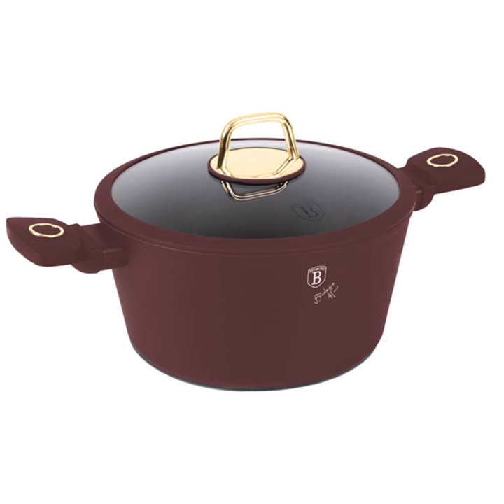 Тенджера с капак от серия LEONARDO в цвят бордо, изработена от кован алуминий с 3-слойно гранитно-мраморно незалепващо покритие, Ф28 см